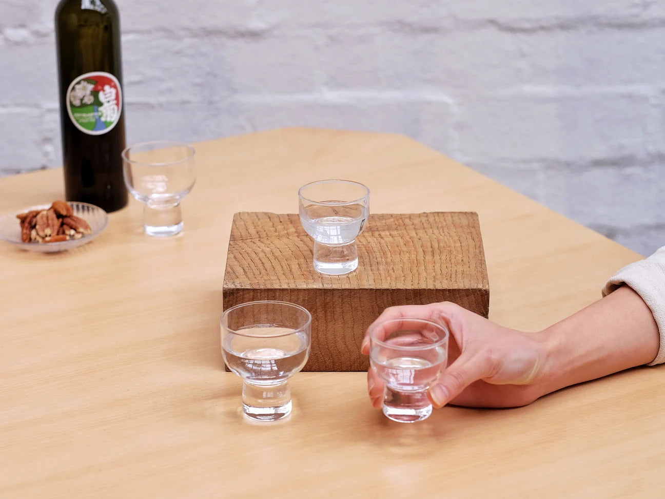 The glass has an overturned bell shape that is playful yet sophisticated just like many of Yanagi's designs. The solid narrow base is designed to prevent the heat from hands from reaching the drink and the wide rounded rim is intended for the drinker to experience the full flavour of the sake/spirit.